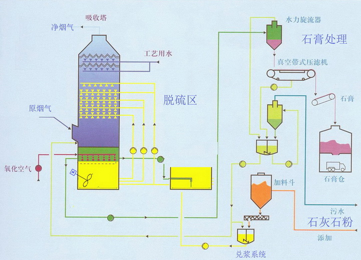 将石灰石(石灰)粉加水制成浆液作为吸收剂,以泵输入吸收塔与烟气充分接触混合,使烟气中的二氧化硫与浆液中的碳酸钙以及从塔下部鼓入的空气进行氧化反应生成硫酸钙,硫酸钙达到一定饱和度后,结晶形成二水石膏经吸收塔排出;